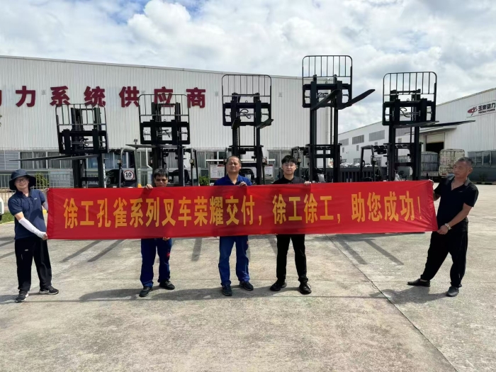 几十台徐工孔雀系列高压重载锂电叉车一落地即成为一道亮眼的风景线,