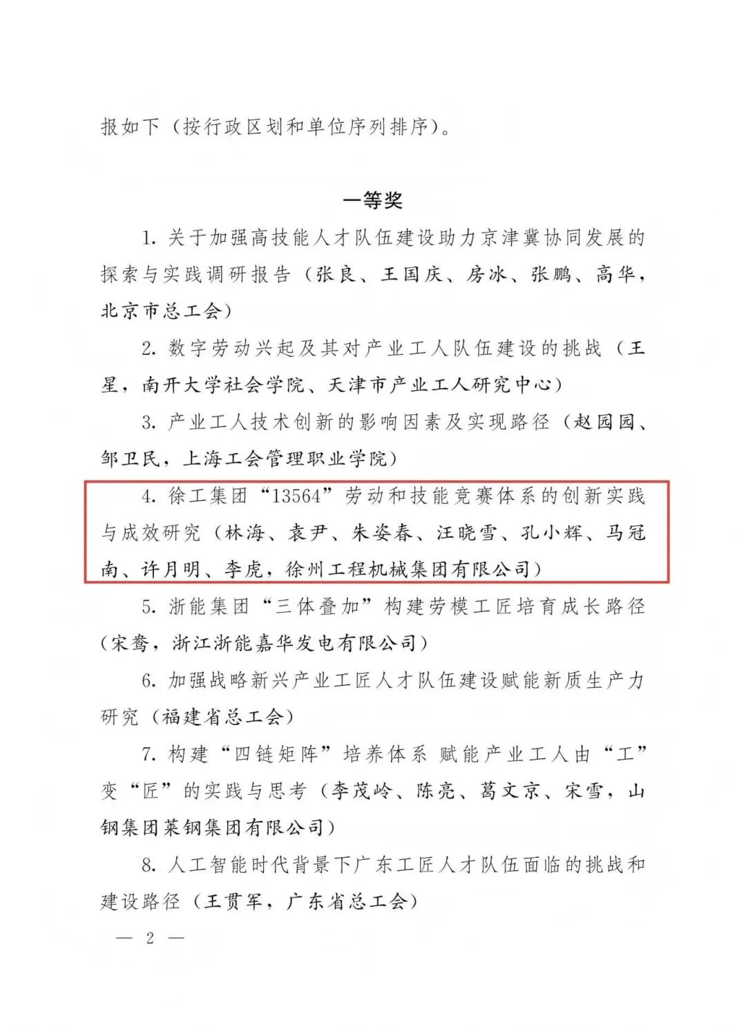 在本次大会主题征文活动中,徐工集团提报的《打造徐工“13564”劳动和技能竞赛模型,拓展产业工人成长新赛道,跑出企业高质量发展加速度》在全国2463篇征文中脱颖而出,成功斩获一等奖。